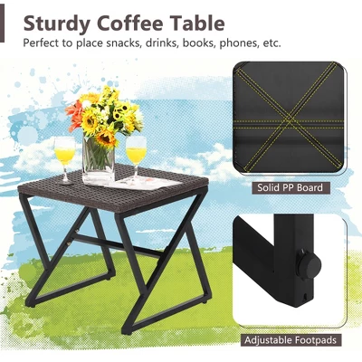 The ergonomic seat with soft cushion offers you endless comfort to sit. And you can rock back and forth with high stability and safety, as the rocking base is solid enough. What’s more, the coffee table is compact yet functional, allowing you to easily fetch the drinks or snacks. And it’s also of high stability with the additional PP board under the tabletop. The footpads of table are adjustable, making it stand more stably even on the ground which is not flat. Last but not least, both the rustproof metal frame and durable hand-woven PE rattan enable the whole set to accompany you for a long-lasting time.